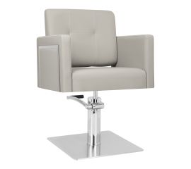 Stylish hairdressing chair. Very comfortable, ideally suited to the interiors of elegant rooms. Adjustable in the vertical plane. Very stable and solid. The upholstery is made of the highest quality grey eco-leather. The elegance of this armchair is complemented by the silver finish of the base.