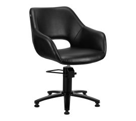 A modern black hairdressing chair. Set on a stable, five-star base. The seat is covered with high-quality eco-leather. The seat is adjustable up and down. A well-profiled seat ensures a comfortable position for the client during hairdressing treatments.
