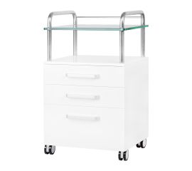 A high-quality podiatry helper is a functional cosmetic piece of furniture on wheels. Thanks to your mobility, you can transport it to other treatment rooms. The assistant has a glass worktop, three drawers for tools, accessories and a shelf for a podiatry milling machine or other device.