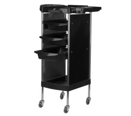 black hairdressing assistant, has many compartments for hairdressing assortment. stable construction will ensure long-term use. table set on guided wheels, thanks to which the tools will always be at hand. the helper has a built-in timer for timing. helper in parts for self-assembly.
