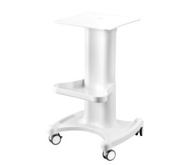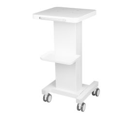 functional plastic table with rubber wheels with a locking function. Perfect as a table for a cosmetic device. has two shelves, one for the device and the other for accessories. the piece of furniture provides convenience and comfort during work.