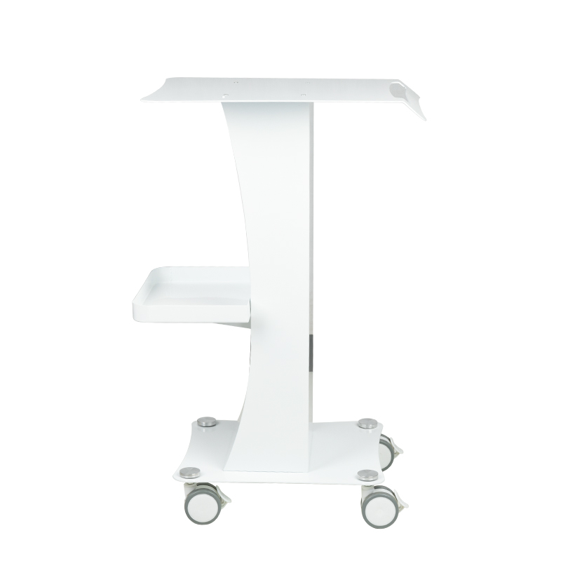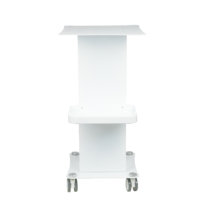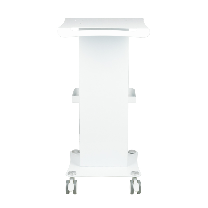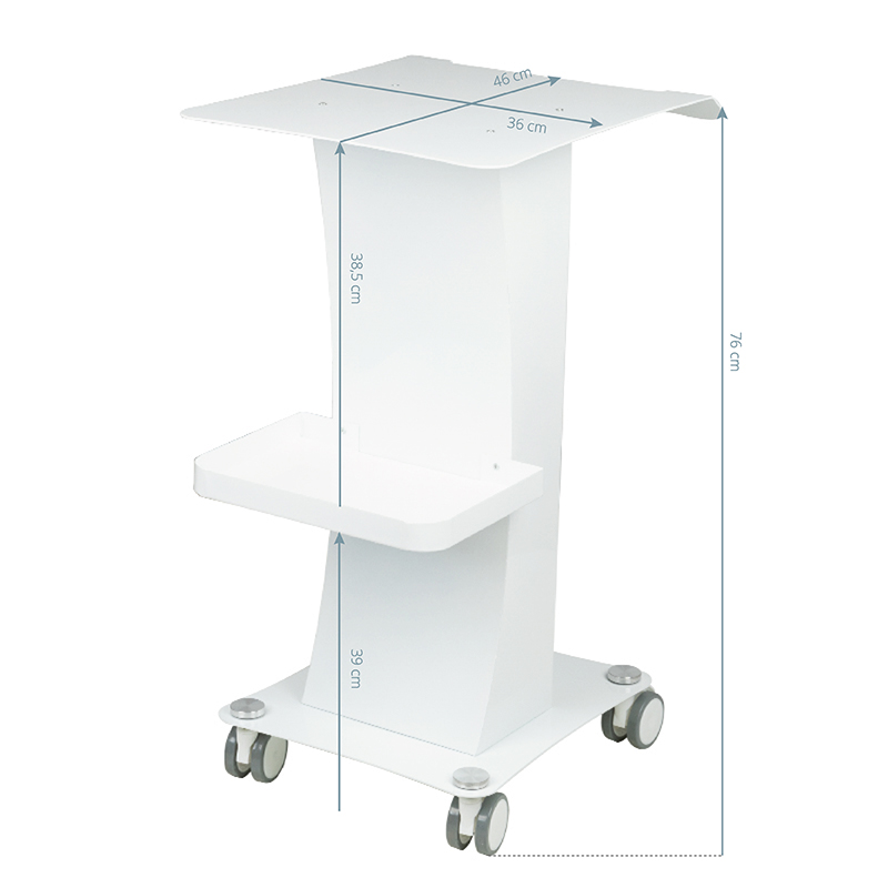 functional, metal table with rubber wheels with a locking function. Perfect as a table for a cosmetic device. it has a stable shelf for the device and another shelf for accessories, and thanks to the wheel, the table is mobile and easy to move. the piece of furniture provides convenience and comfort during work.
