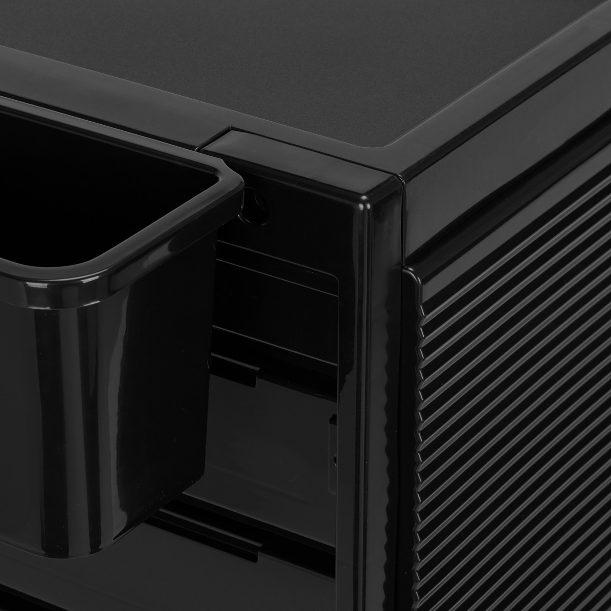 On top of the helper is a shallow recess, which will be great for putting away tools while you work. It will also be a great place to put the most necessary accessories for the duration of the service – as in the case of coloring – bowls, paints or brushes. The surface of the recess – like all the trays in the set – is covered with a matt, rough, non-slip layer, thanks to which it cushions and keeps the placed instruments in a given place.