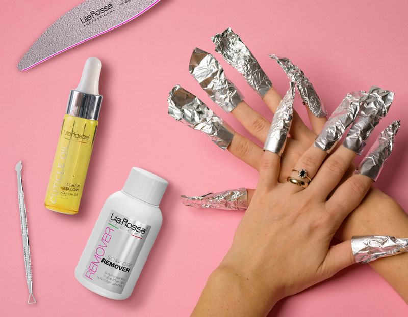 Trascorso il tempo, rimuoviamo il foglio di alluminio e i tamponi di cottone. Con l'aiuto di uno strumento speciale o di un bastone per cuticole, rimuoviamo i frammenti di smalto. Molto probabilmente, si staccherà abbastanza facilmente.