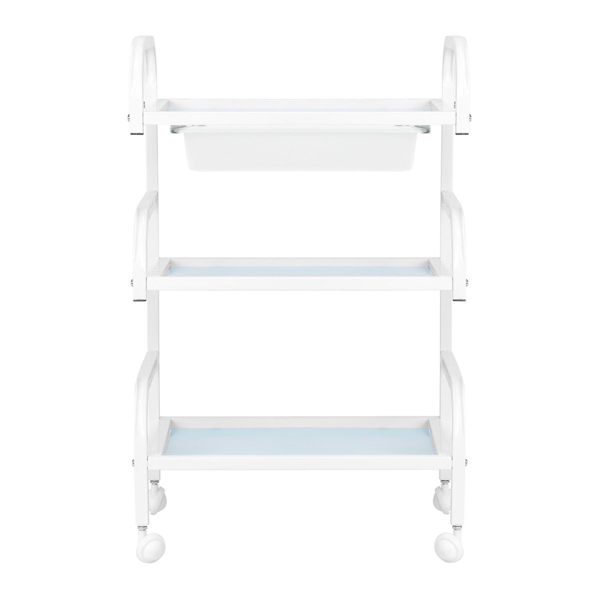 The frame made of durable aluminum in shades of white and the glass shelves create a modern and aesthetic whole that is easy to keep clean. Four wheels ensure mobility for easy organisation of the workspace, while solid materials guarantee stability and durability of use.
