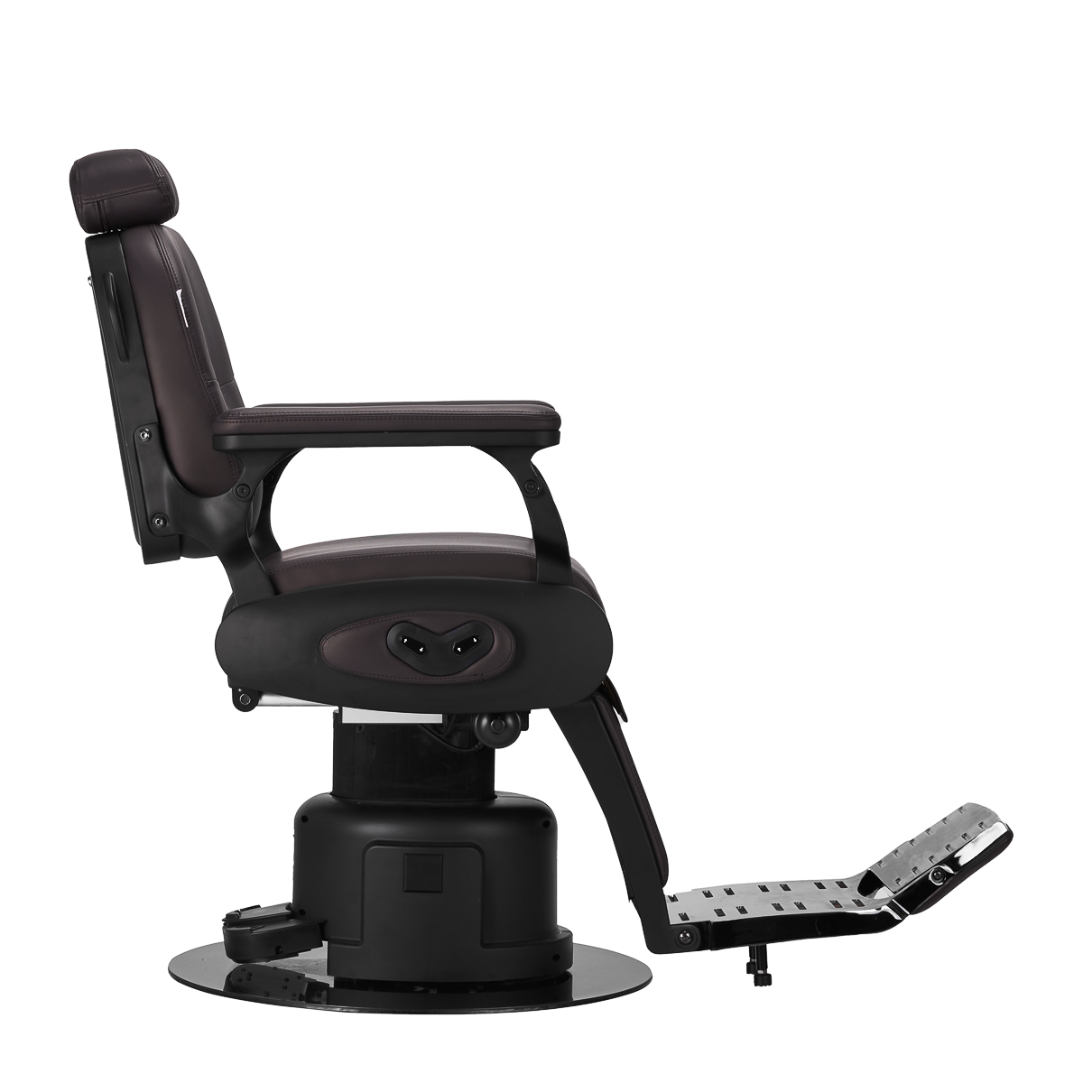 The electric control system guarantees wide adjustment possibilities. It allows for precise adjustment of the seat height in the range of 58-72 cm and almost full rotation, which gives barbers significant freedom of movement, even in smaller spaces. It is controlled both by buttons located on the side of the chair and by foot control, which gives additional flexibility during work. The backrest and footrest are also raised electrically, which allows for quick and smooth adjustment of the client's position to the treatment being performed.