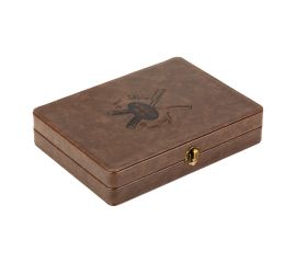 Elegant and practical organizer for scissors covered with ecological leather. Inside, it has two recesses with scissor handles and a partition with envelopes. The organizer is closed with a metal latch. On the front there is an embossed graphic with a hairdressing theme. Number of...