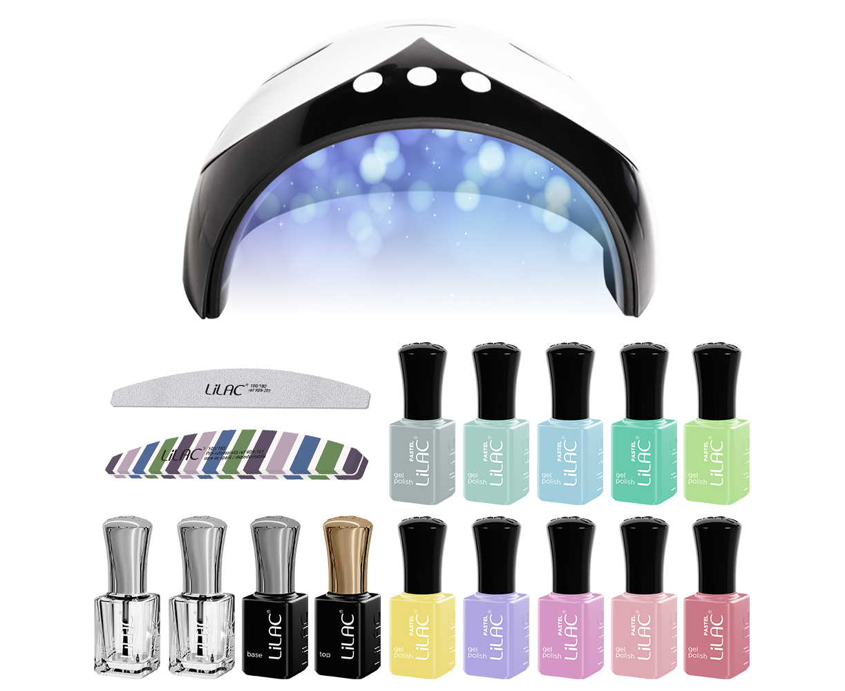 Kit smalto semipermanente Lilac, 14 smalto, Pastel colors, Lampada LED unghie, lima unghie e buffer, kit unghie semipermanente