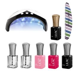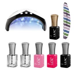 • Kit completo con smalti semipermanenti, base coat, top coat e lampada UV/LED.