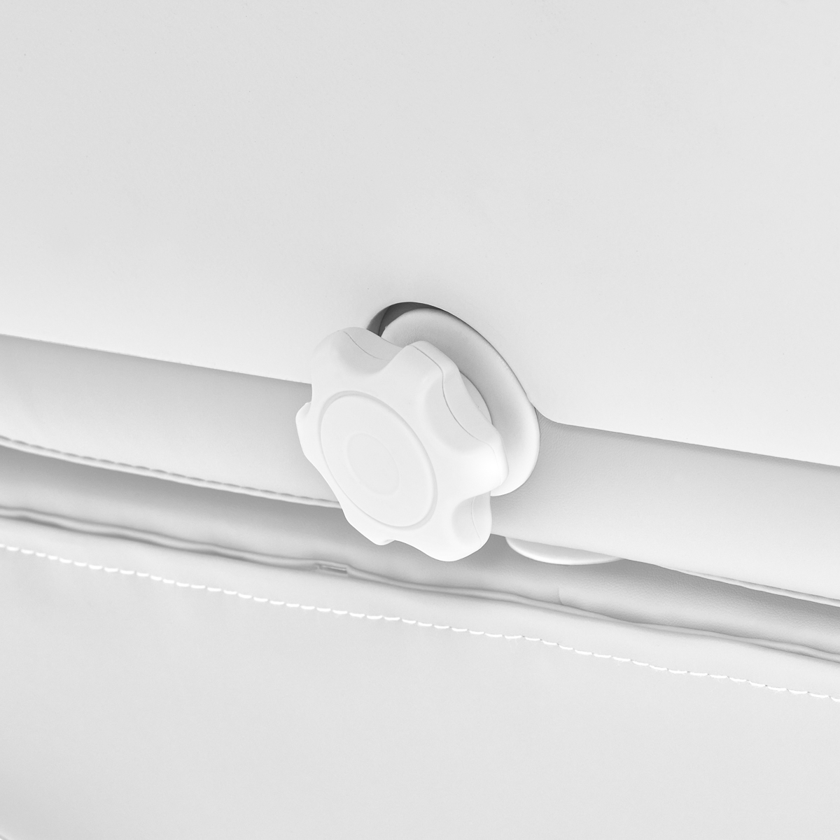 The chair is filled with foam of appropriate hardness and covered with pleasant-to-touch imitation leather in shades of white. Thanks to the use of a material that is easy to keep clean and resistant to selected disinfectants, the equipment is comfortable to use, resistant to moisture and easy to clean. A solid base made of durable white material ensures stability during treatments. Properly profiled hems give the chair a stylish look and make the seat ergonomic.