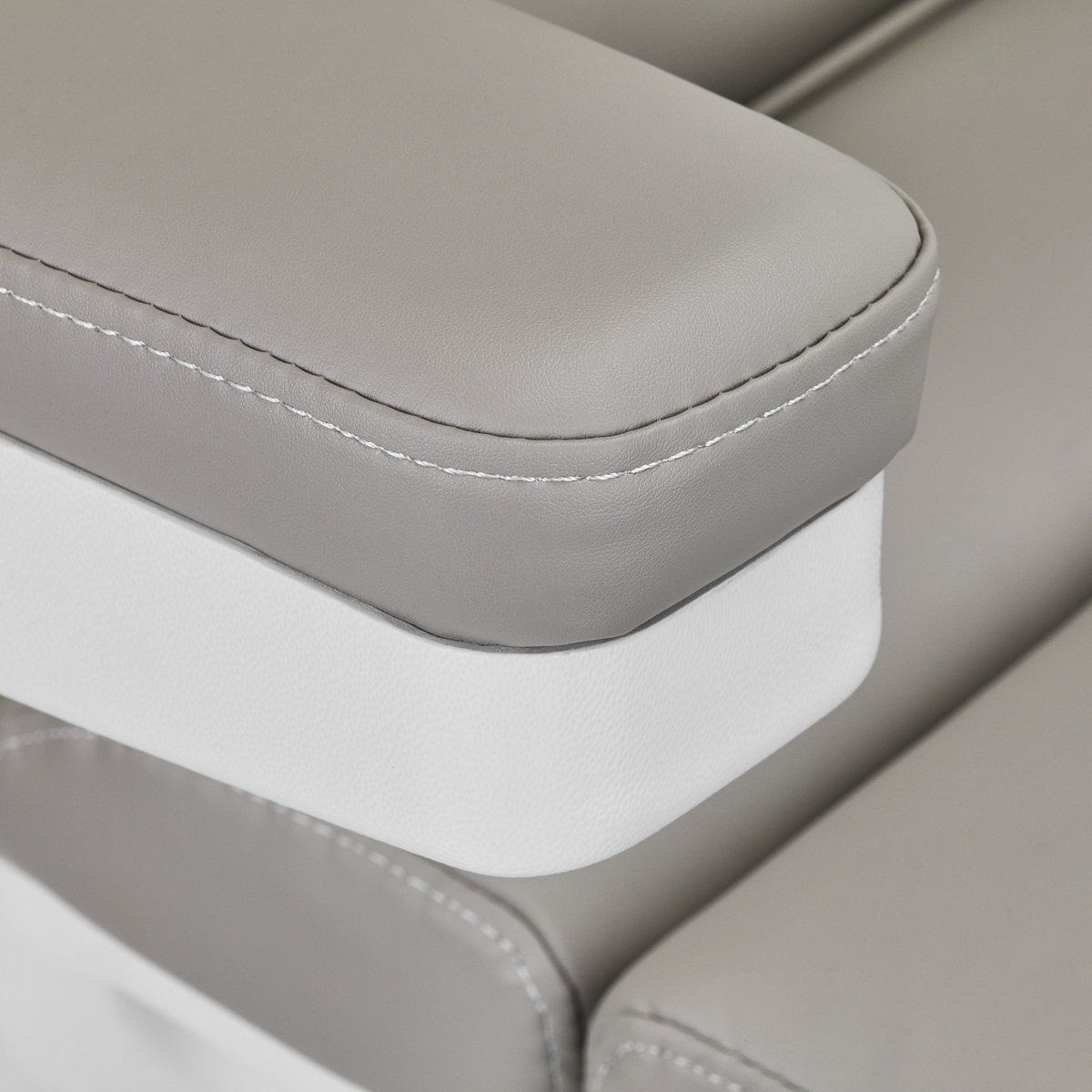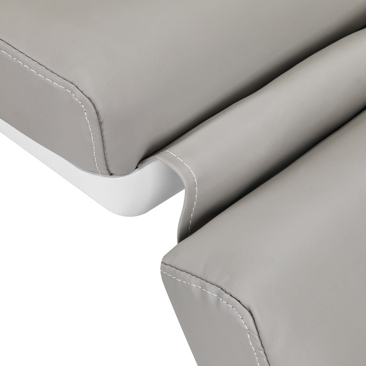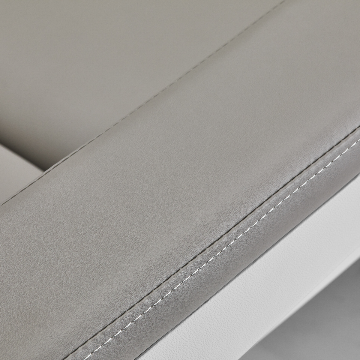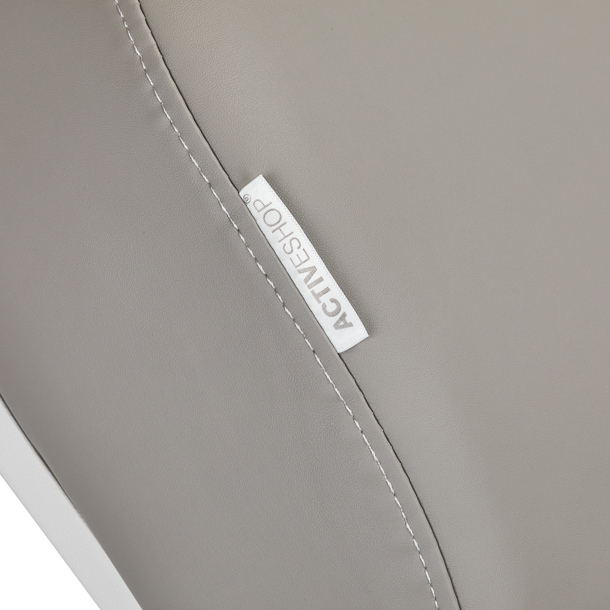 The chair is filled with foam of appropriate hardness and covered with pleasant-to-touch imitation leather in shades of gray. Thanks to the use of a material that is easy to keep clean and resistant to selected disinfectants, the equipment is comfortable to use, resistant to moisture and easy to clean. A solid base made of durable white material ensures stability during treatments. Properly profiled hems give the chair a stylish look and make the seat ergonomic.
