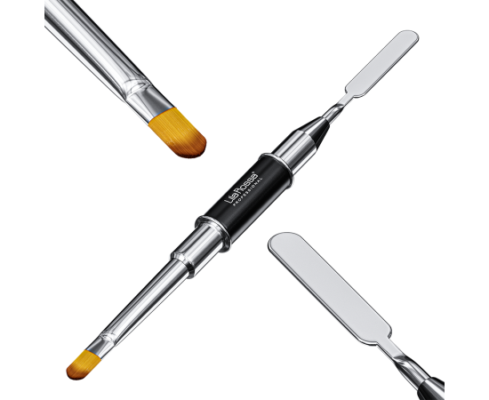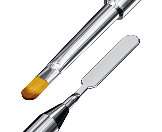 Un'estremità consente una stesura precisa del prodotto e l'altra estremità è rappresentata da una spatola in acciaio inossidabile consigliata per: Acryl Gel, Poly Gel o One Step Gel.