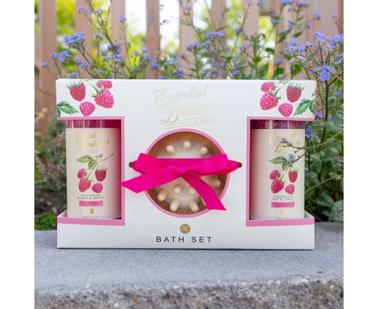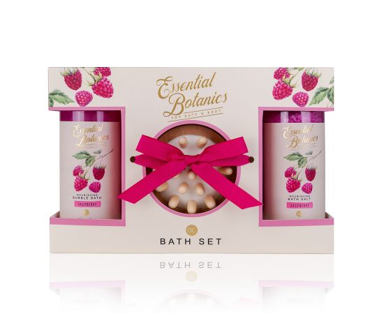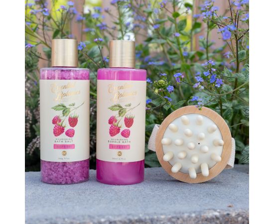 Regalo donna, bagnoschiuma, bagno schiuma, sale da bagno, spazzola de masaj, Bath set ESSENTIAL BOTANICS - FRUITS in paper gift box, 200ml bubble bath, 260g bath salt, massage brush, design/fragrance: Raspberry, regali di natale