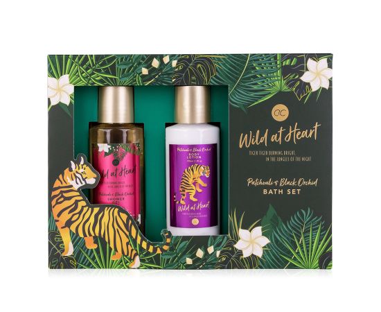 Regalo donna, bagnoschiuma, crema viso, Bath set WILD AT HEART in gift box, 100ml shower gel, 100ml body lotion, fragrance: Patchouli & Black Orchid, col. green/gold/black, regali di natale