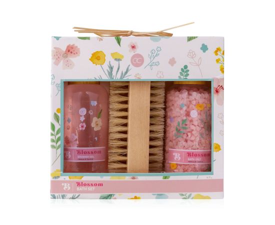 Regalo donna, bagnoschiuma, sale da bagno, spazzola, Bath set BLOSSOM in gift box, 100ml shower gel, 100g bath salt, nail brush, fragrance: Hibiscus & Coconut, col. white/light pink/yellow, regali di natale