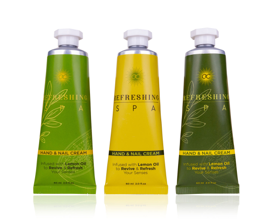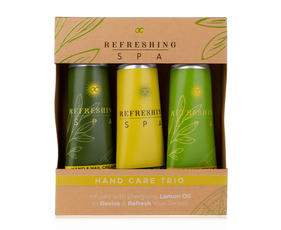 Regalo donna, crema per la mani, Hand care set REFRESHING SPA in gift box, 3 * 60ml hand & nail cream, infused with Lemon Oil, fragrance: Lemon & Jasmine, col. green/yellow/brown, regali di natale