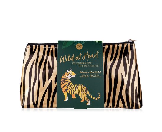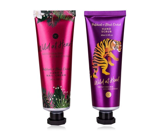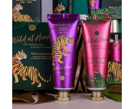 Regalo donna, crema per la mani, scrub, Hand care set WILD AT HEART in cosmetic bag, 60ml hand & nail cream, 60ml hand scrub, fragrance: Patchouli & Black Orchid, col. green/gold/black, regali di natale
