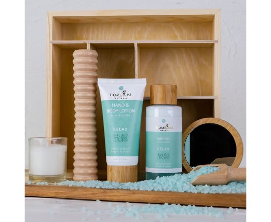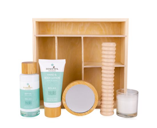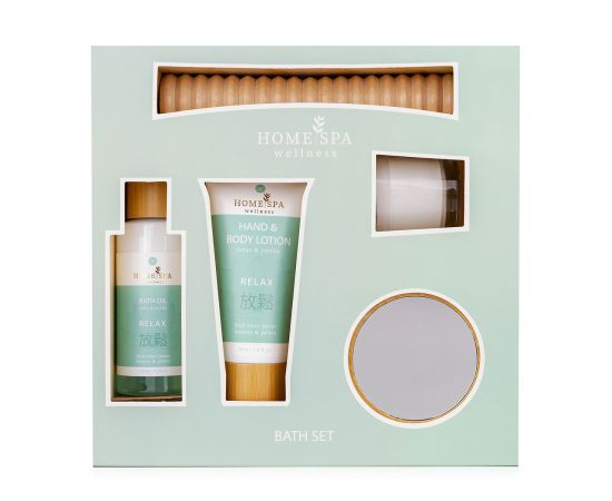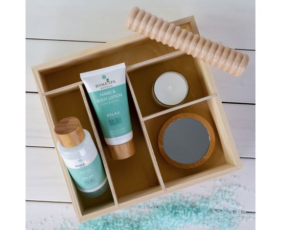 Regalo donna, olio doccia, crema viso e mani, aparat de masaj, lumanare parfumata, Bath set HOME SPA in wooden storage box, 100ml bath oil, 60ml hand & body lotion, fragrance candle, mirror, wooden massager, fragrance: Lotus & Jojoba, col. mint green/brow