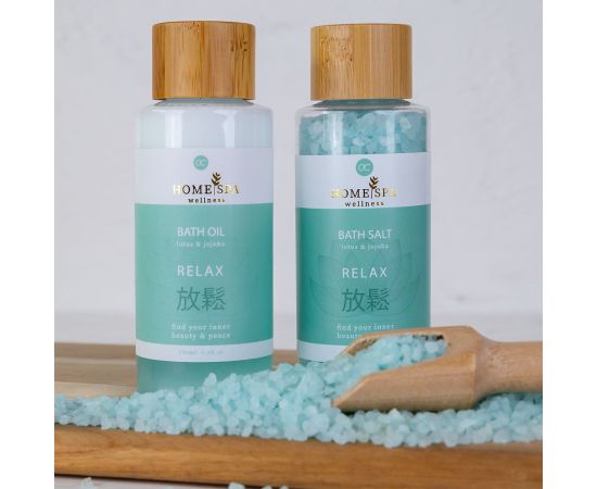 Regalo donna, olio doccia, sale da bagno, Bath set HOME SPA in paper gift box, 100ml bath oil, 100g bath salt, fragrance: Lotus & Jojoba, col. mint green/brown/white, regali di natale
