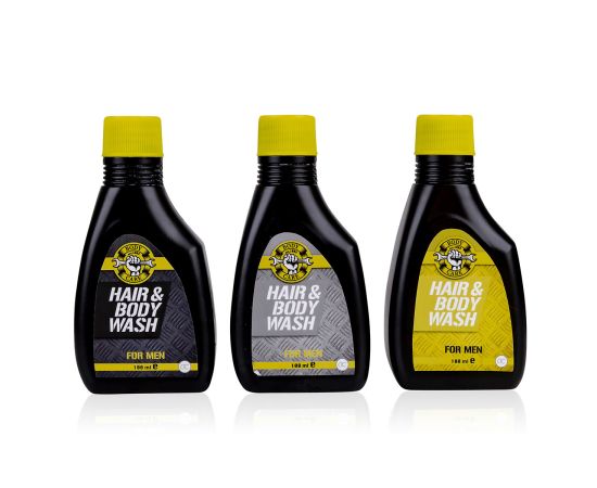 Regalo uomo, bagnoschiuma, 100ml hair & body wash BATH & BODY TOOLS (shape: engine oil bottle), fragrance: Musk, black / yellow / grey in display , regali di natale