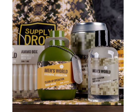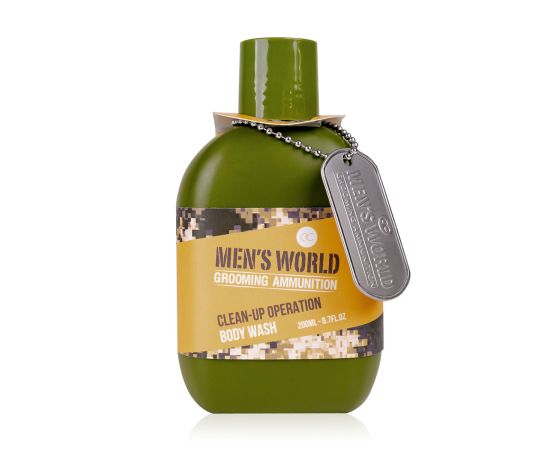 Regalo uomo, bagnoschiuma, 200ml body wash MEN'S WORLD in bottle, inkl. dog tag, fragrance: Oak & Amber, col.: olive green/ochre/orange, regali di natale