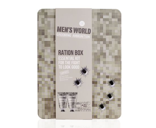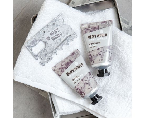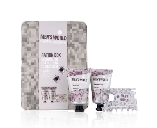 Regalo uomo, bagnoschiuma, balsamo dopobarba, multi-tool, Gift set MEN'S WORLD in tin box, 50ml body wash, 50ml balsamo dopobarbabalm, multi tool, fragrance: Oak & Amber, col.: cream/brown/grey, regali di natale
