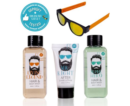 Regalo uomo, bagnoschiuma, balsamo dopobarba, ochelari soare, Bath set HIPSTER STYLE in paper gift box, 2 x 60ml hair & body wash, 20ml balsamo dopobarbalotion and Wrist Slap Foldable Sunglasses, fragrance: Oak & Citrus, col. white/orange/blue, regali di