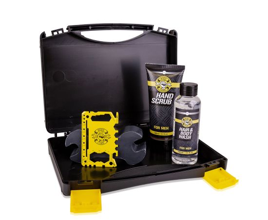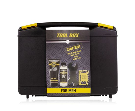 Regalo uomo, bagnoschiuma, scrub, sapone, spazzola, Bath set BATH & BODY TOOLS in tool box, 100ml hair & body wash, 100ml hand scrub for dirty hands, 120g wrench soap, multi tool, fragrance: Musk, col.: black/yellow/grey, regali di natale