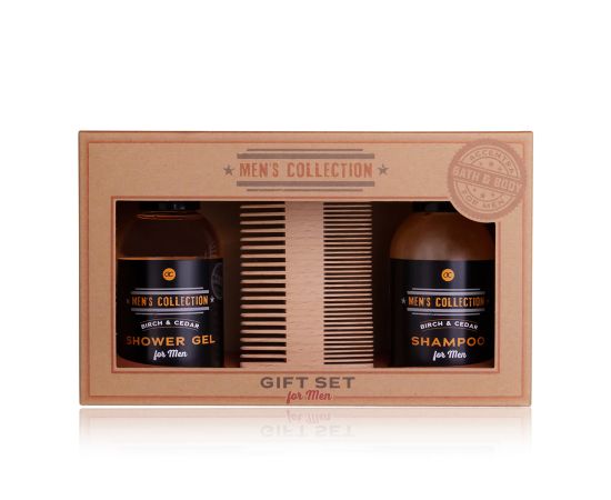 Regalo uomo, bagnoschiuma, shampoo, pieptene barba, Gift set MEN'S COLLECTION 100ml shower gel, 100ml shampoo, wooden comb, fragrance: Birch & Cedar, col. brown, regali di natale
