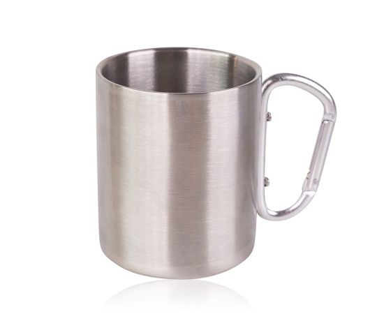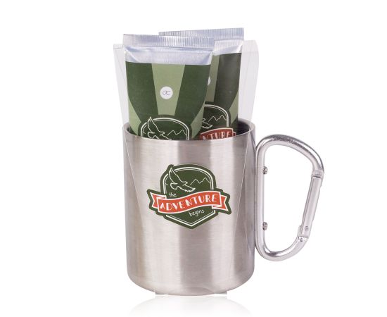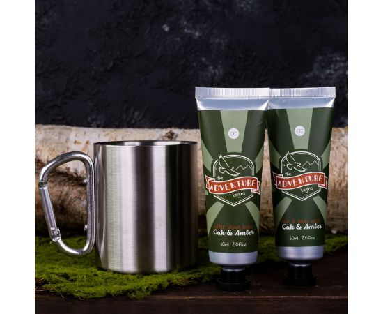 Regalo uomo, bagnoschiuma, tazza metallo, balsamo dopobarba, Bath set ADVENTURE COLLECTION in stainless-steel mug (350ml) with carabiner handle, 60ml hair & body wash, 60ml balsamo dopobarbabalm, fragrance: Oak & Amber, col. green/orange, regali di natale