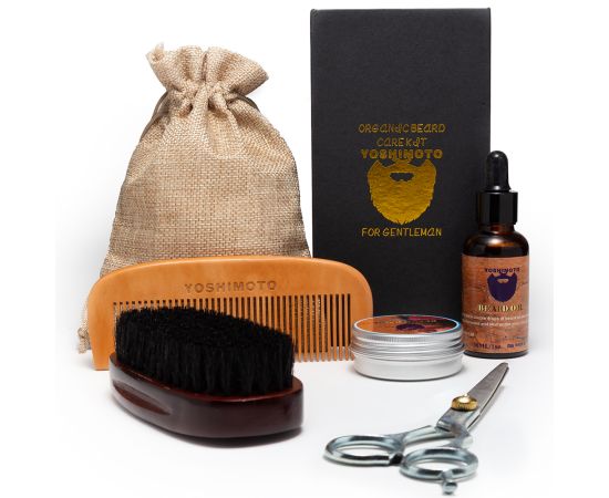 Il set di Yoshimoto contiene gli strumenti necessari e i prodotti ideali per barba e baffi da parrucchiere.