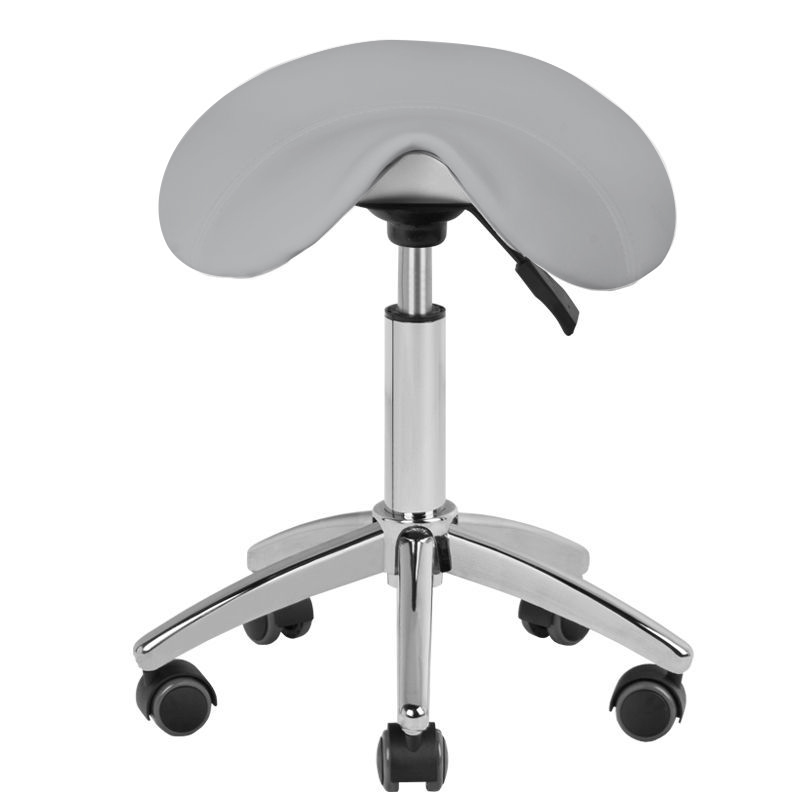 comfortable, stable cosmetic stool without a back, with a profiled seat, on a five-star base with rubberized wheels, gray color, necessary piece of furniture in a beauty salon.