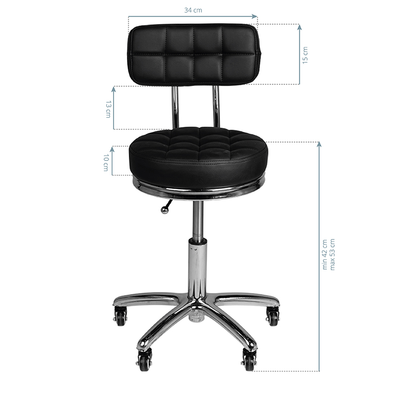 black cosmetic stool with a quilted seat and a comfortable backrest. it is height-adjustable and the arm-like base is equipped with solid metal-rubber wheels.