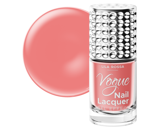 4. Applicare uno strato di Vogue Nail Lacquer partendo dalla base dell'unghia fino alla punta senza toccare la cuticola, poi continuare a modellare l'unghia applicando lo smalto sui lati partendo dalla cuticola fino alla punta, si asciuga in 60 secondi, nell'aria. Per una copertura perfetta, applica il secondo strato, secondo le preferenze, con una pausa di 60 secondi tra gli strati.