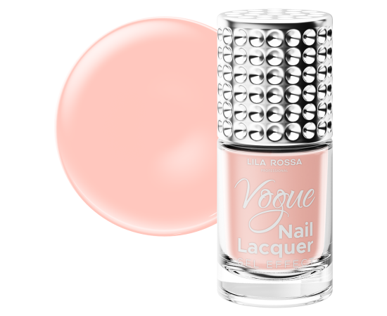 4. Applicare uno strato di Vogue Nail Lacquer partendo dalla base dell'unghia fino alla punta senza toccare la cuticola, poi continuare a modellare l'unghia applicando lo smalto sui lati partendo dalla cuticola fino alla punta, si asciuga in 60 secondi, nell'aria. Per una copertura perfetta, applica il secondo strato, secondo le preferenze, con una pausa di 60 secondi tra gli strati.