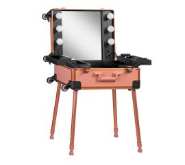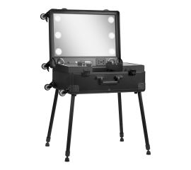 A functional cosmetic box in the form of a comfortable, portable suitcase on wheels. The perfect solution for mobile beauticians or make-up artists. Very roomy. It has four telescopic legs, thanks to which we can properly adjust the height of the station. Lighting on the sides of the mirror....