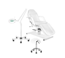 the set includes: - hydraulic a210 chair, - s5 led magnifier lamp, - cosmetic stool. a-210 hydraulic cosmetic chair swivel armchair with a lock, raised and lowered hydraulically and with a hole in the headrest, perfect for cosmetics, make-up and massage. it has removable armrests...