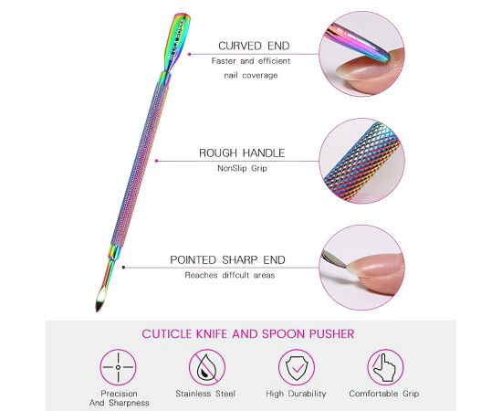- utilizzare l'estremità arrotondata per spingere la cuticola e l'estremità appuntita per rimuovere la cuticola