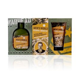Regalo uomo, bagnoschiuma, balsamo dopobarba, esarfa, Bath set MEN'S WORLD in paper gift box, 200ml body wash, 75ml balsamo dopobarbabalm, scarf/face mask with camouflage print, fragrance: Oak & Amber, col.: olive green/ochre/orange, regali di natale