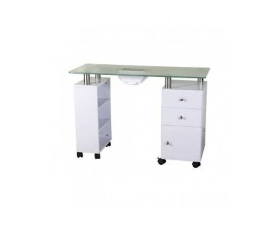Tavolo manicure con piano in vetro, 2 cassetti, 3 vani portaoggetti senza ante e un armadietto sotto i cassetti Il tavolo manicure è il mobile che ogni onicotecnico dovrebbe avere.
