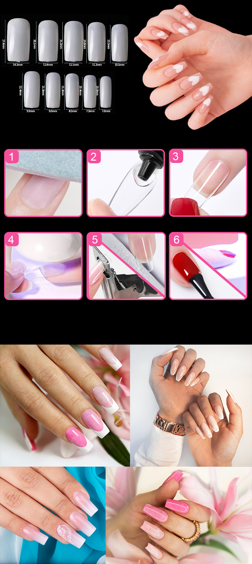 Consentono la creazione di estensioni in modo molto semplice. Si attacano facilmente sull'unghia naturale e hanno dimensioni diverse per adattarsi a ogni forma di unghia.